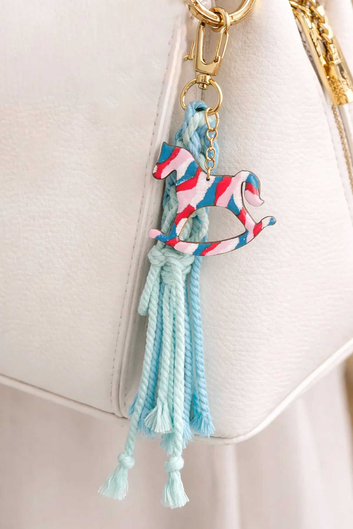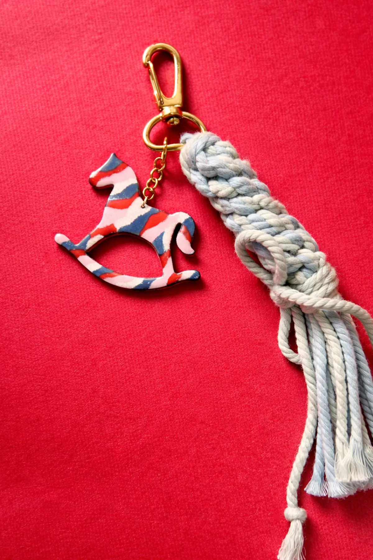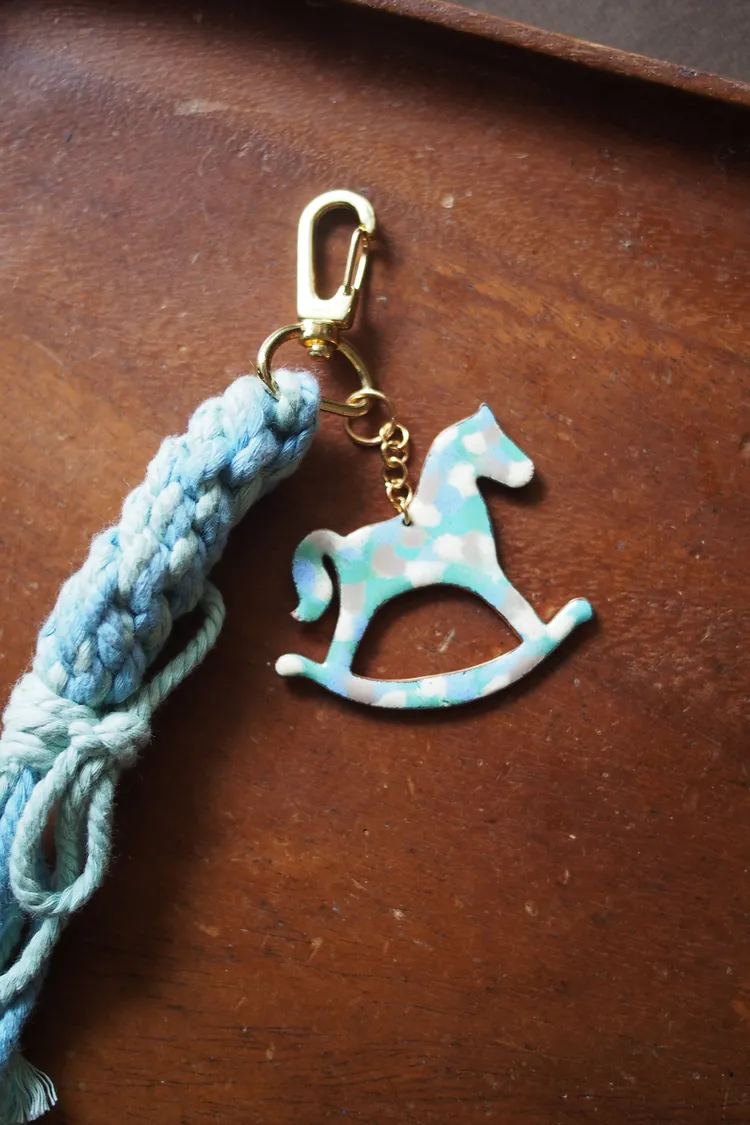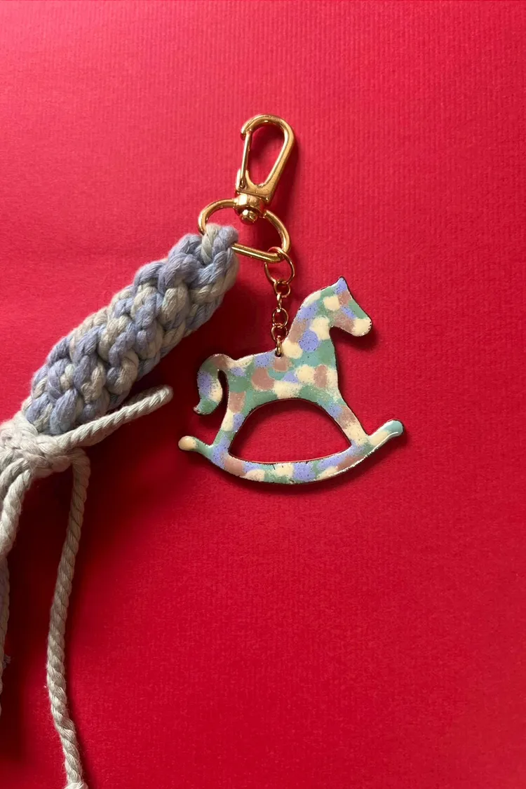 •本款吊飾以手工琺瑯彩馬為主體,雙面呈現不同圖案設計,可依心情與搭配自由轉換佩戴。色彩在燒製過程中自然流動,每一件皆擁有獨一無二的紋理表情;搭配藍綠雙色編織流蘇,象徵守護與連結。金色五金細節在柔和光線下低調閃耀,日常中也能感受到節慶的溫度。